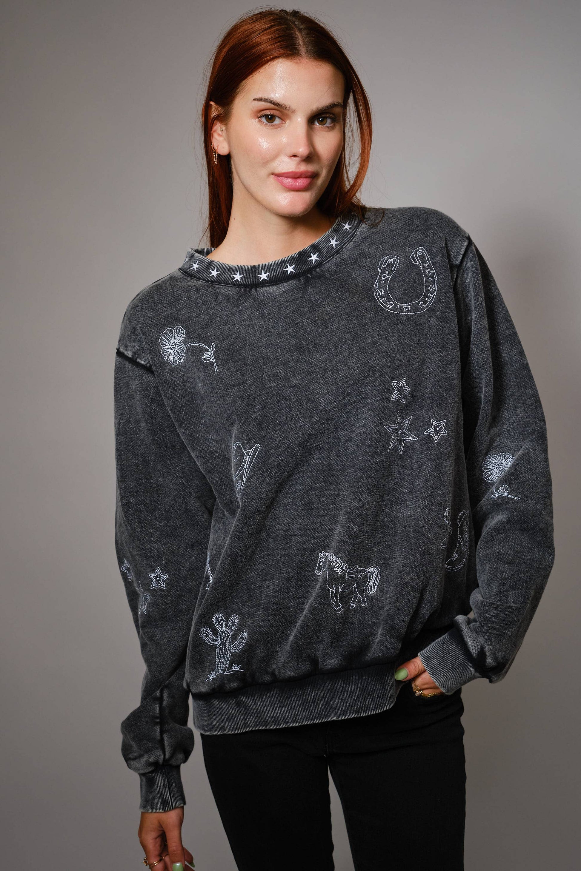 Oversized pullover sweatshirt featuring western-inspired linework embroidery with floral, star, horse, cactus, and cowboy motifs, finished with a star-printed ribbed neckline and mineral wash for a vintage look