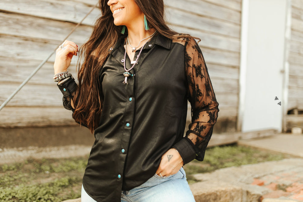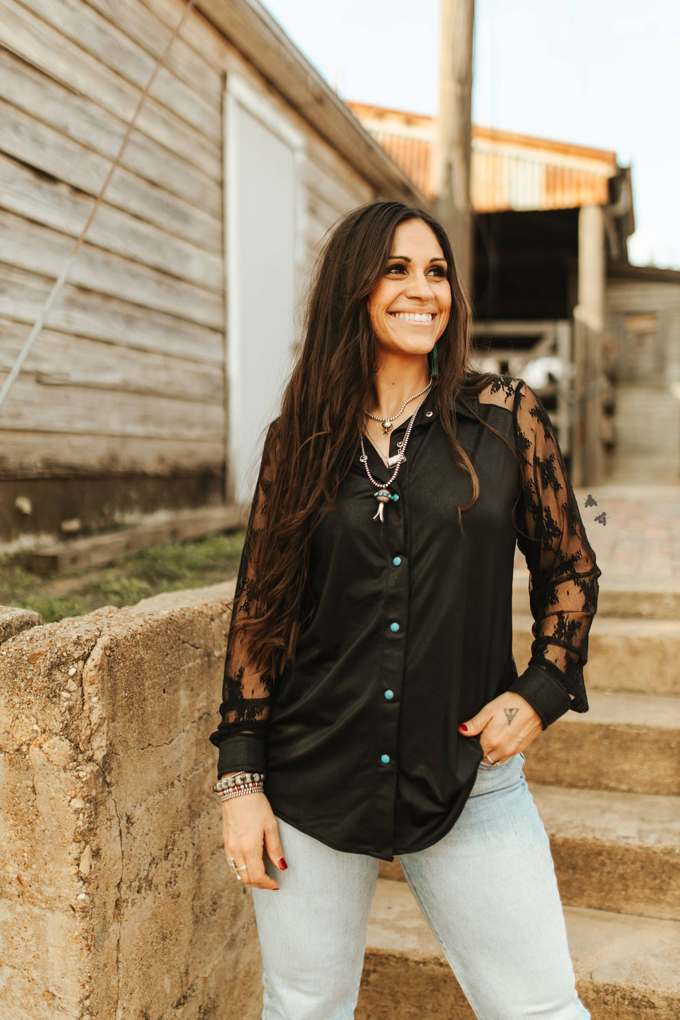 what's better than a satin button up with turquoise buttons? A LACE SLEEVE satin button up with turquoise buttons.... cause winter should be over soon let's que the sunshine... LACE will trend... and we ARE HERE FOR IT.