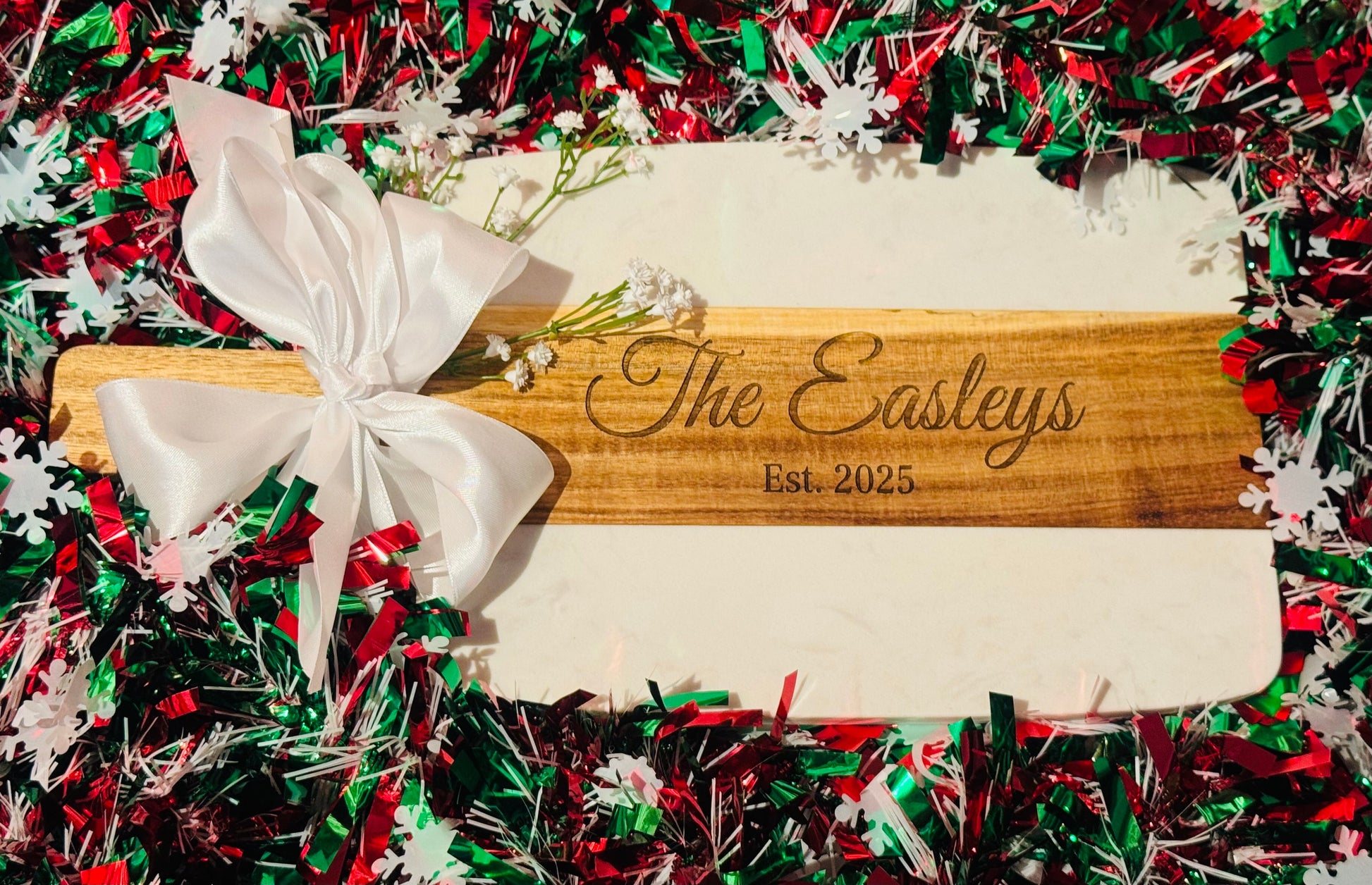 Engraved on a white marble and acacia wooden cutting board