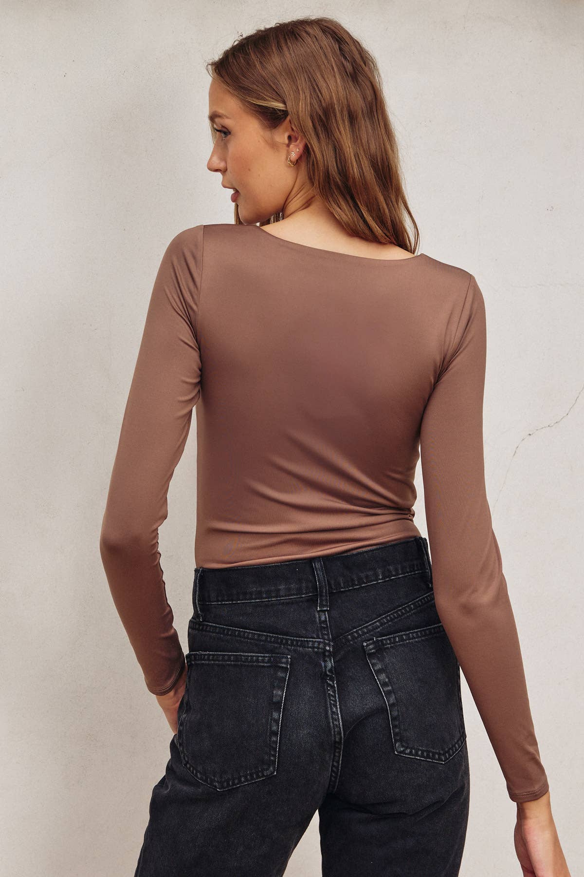 Long sleeve bodysuit with a square neckline. Thong-cut bottom with snap button closure. Unlined. Shell: 97% Polyester, 3% Spandex Lining: N/A