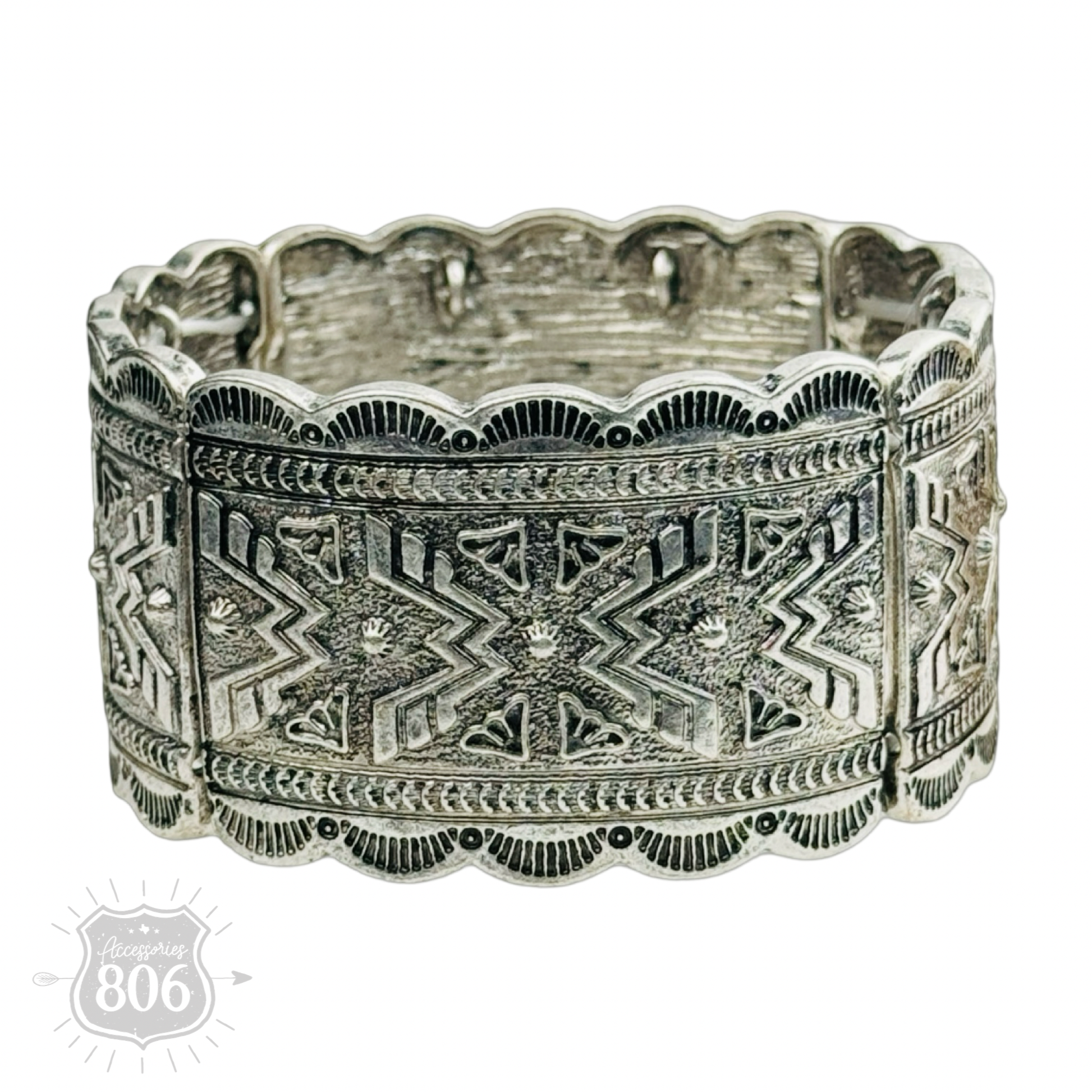 Southwest style bracelet cuff featuring stamped look silver tone scalloped edge. Stretches for easy on and off. One size fits most.