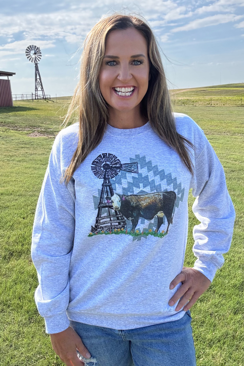 Elevate your casual wardrobe with this unique gray sweatshirt featuring a bold design of a bald-faced cow, intricate Aztec patterns, and a charming windmill. Crafted for comfort and style, it combines classic elements with eye-catching details to keep you cozy while showcasing your distinctive taste. Perfect for everyday wear or making a statement, this sweatshirt promises warmth and personality in one versatile piece.