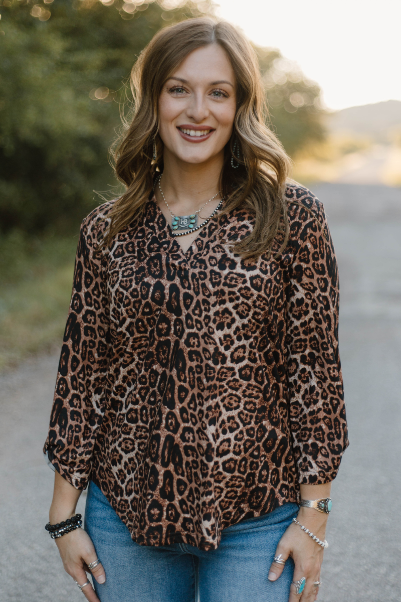 Embrace bold style with the Range & Roar Top, featuring a striking leopard print and flattering quarter sleeves. Perfect for adding a fierce touch to any outfit, this top combines comfort and eye-catching design to elevate your everyday look effortlessly.