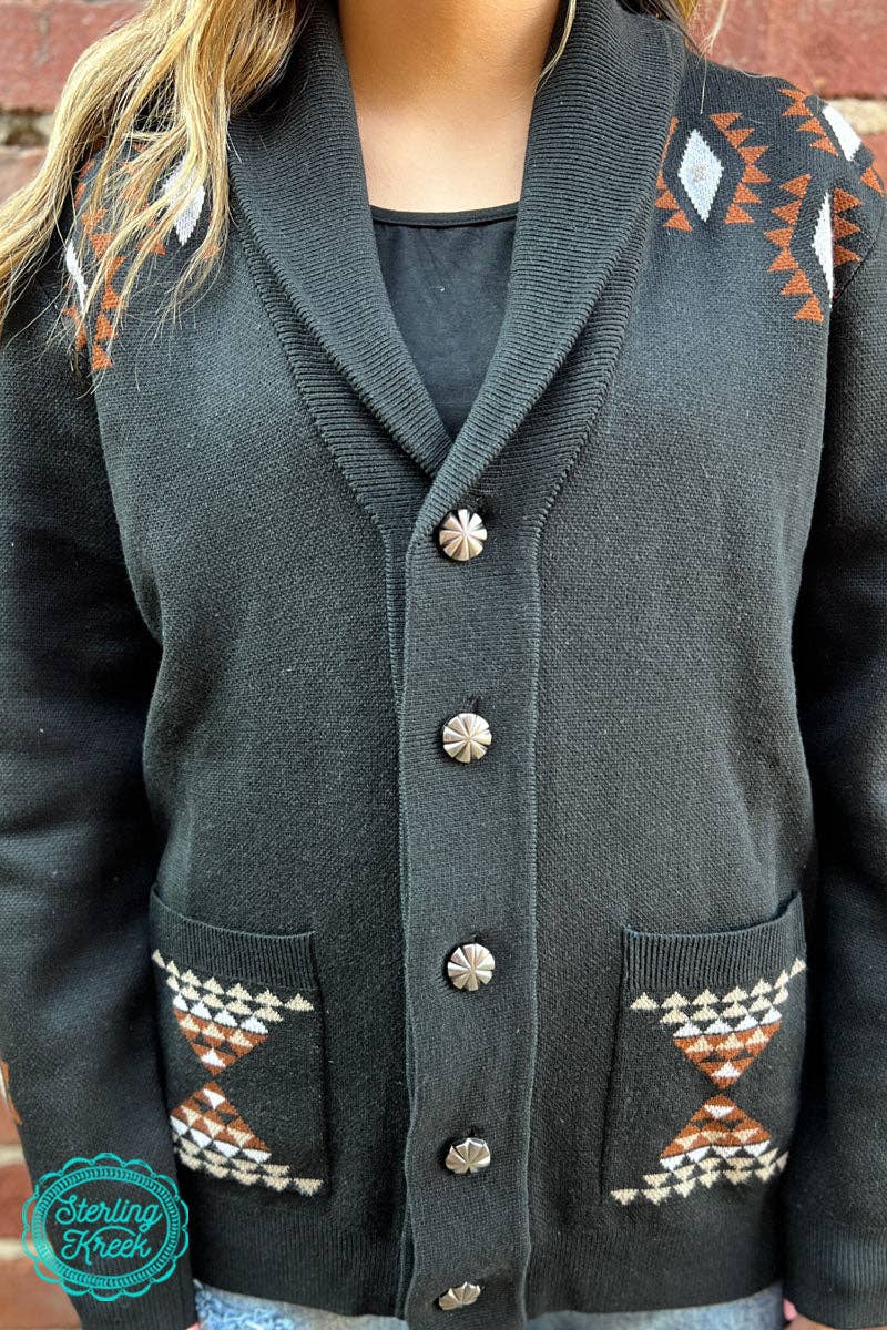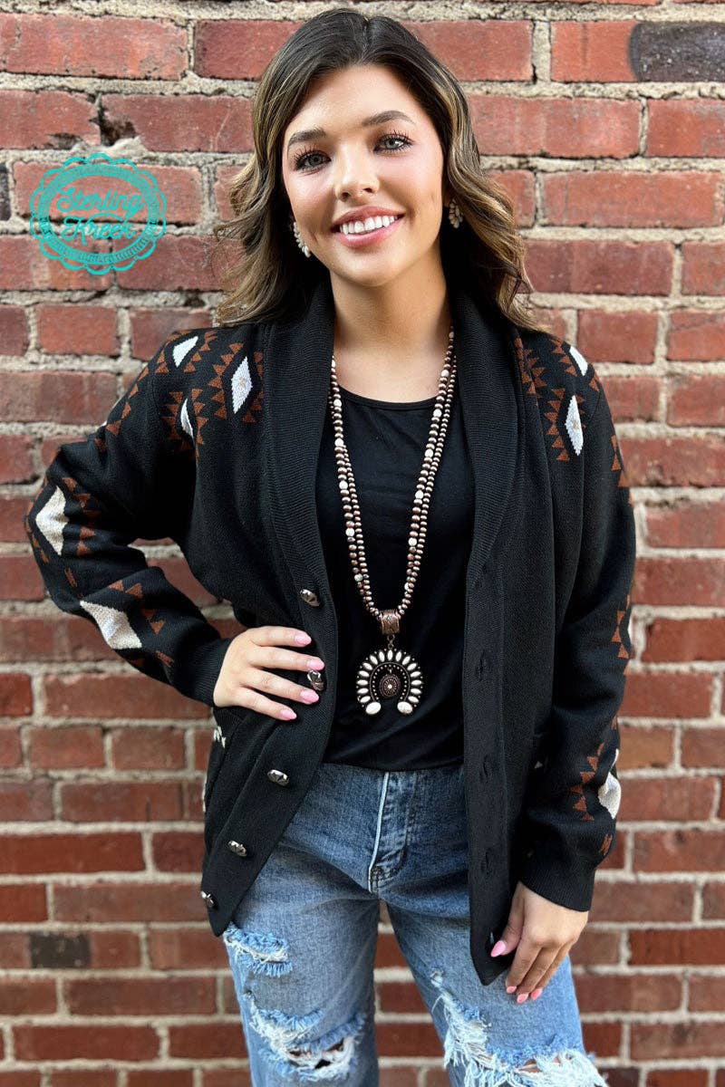 Stay warm and conquer the cold with our playful Stand By Me Knit Sweater. This button-up sweater is a statement piece with a unique print on the back and sides. Add some quirkiness to your wardrobe while staying cozy!