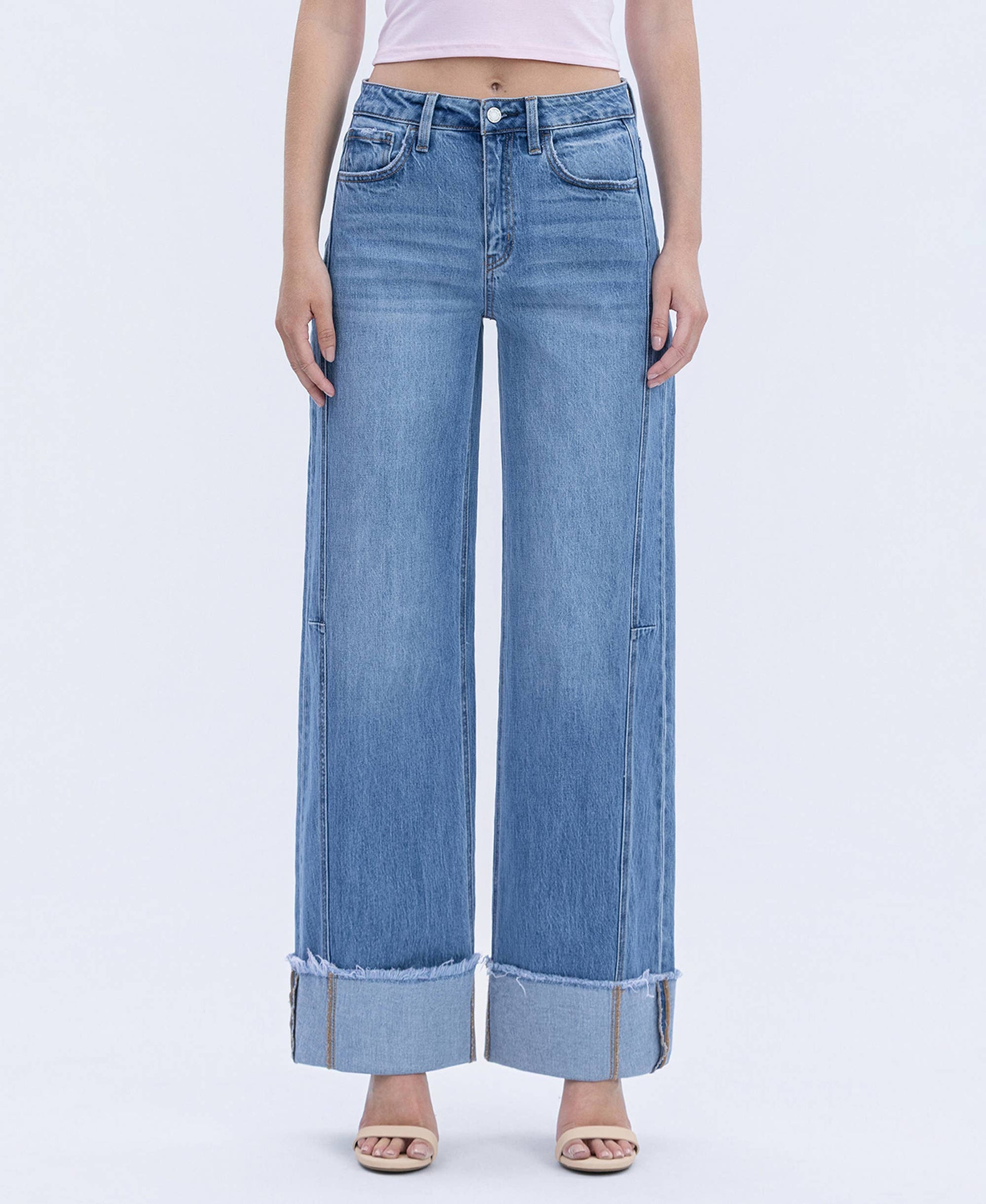 COMFORT STRETCH DENIM, HIGH RISE WAIST, SINGLE CUFF HEM, FULL LENGTH, WIDE JEANS