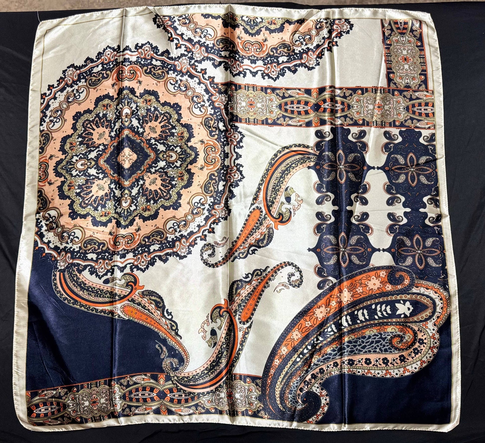 Tan/Navy Paisley 36"x36" satin wild rag-scarf is a versatile accessory adding interest to any outfit or accessory. Inspired by southwestern and cowboy culture, it's a testament to our commitment to quality and design. Enjoy the luxurious feel and soft sheen of satin.